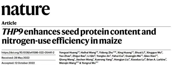 北京時間2022年11月17日,中國科學院分子植物科學卓越創新中心巫永睿研究團隊與上海師范大學王文琴研究團隊合作在Nature上發表了題為 “THP9 enhances seed protein content and nitrogen-use efficiency in maize”的研究論文。